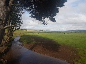 Final leg of the day, 17 miles to Peebles. Crossing from the Clyde Valley to the Tweed. There were hills, as you’d expect. In among the brightness and the dark clouds, and the promise of rain in the air, a rainbow climbed right out of the Tweed, decorating the valley ahead of me. I chased it, happily, all the way to Peebles.